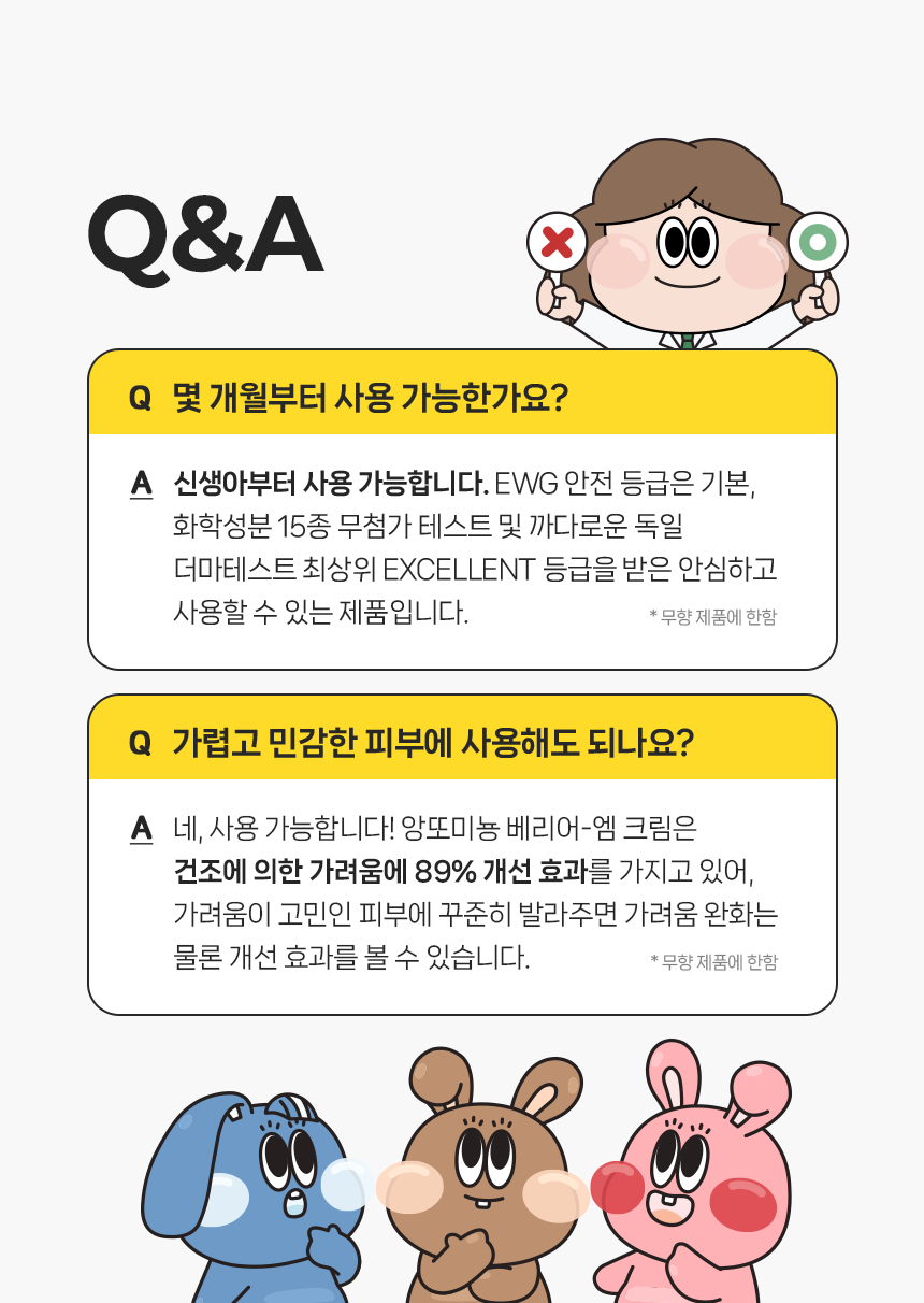 사용방법 로션 사용 후, 혹은 집중 케어가 필요할 때마다 수시로 적당량을 덜어 피부에 부드럽게 펴 발라주세요. - 건조한 부위는 여러 번 덧발라 주시면 좋습니다.