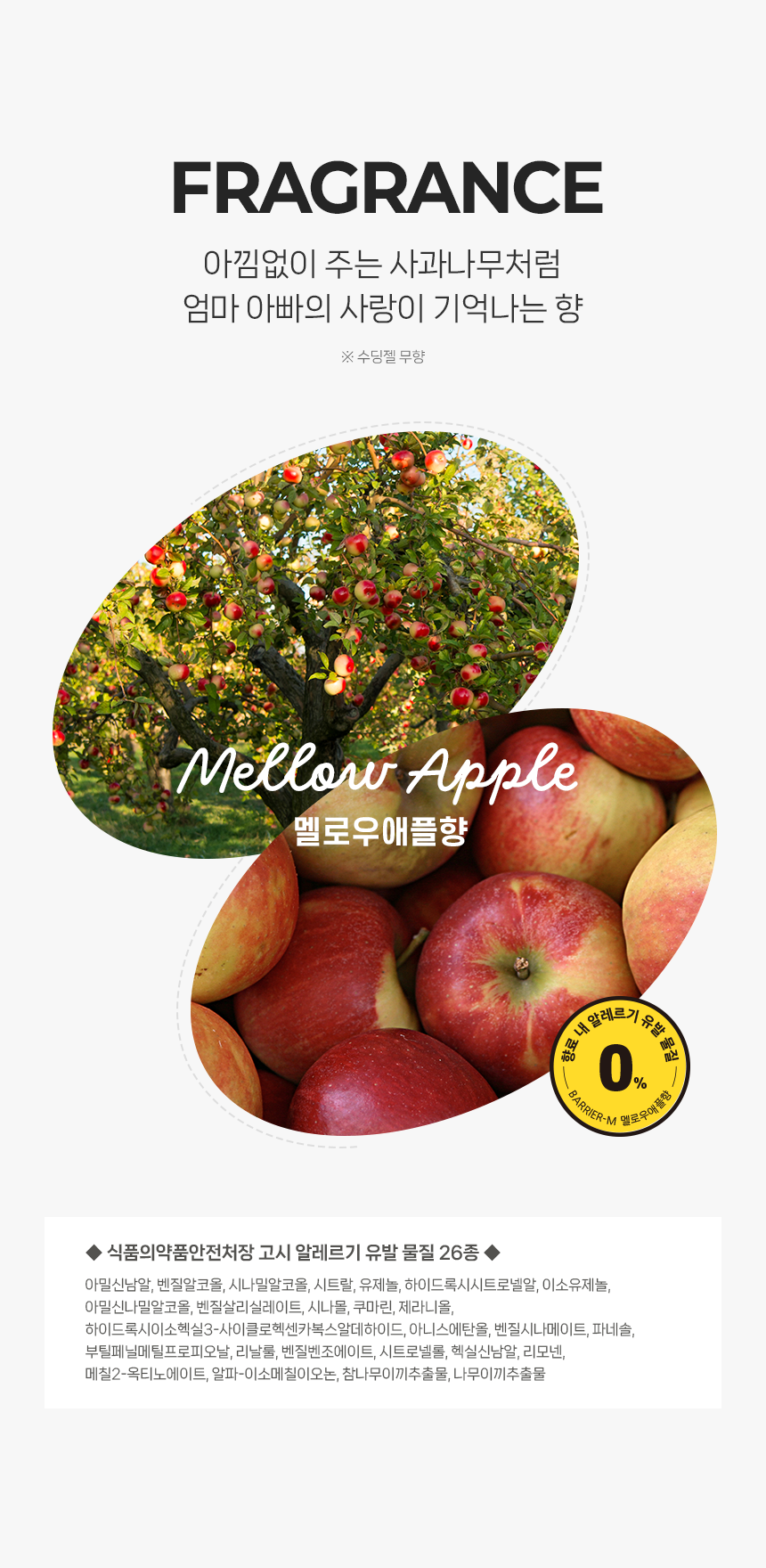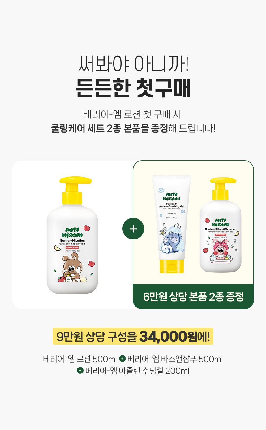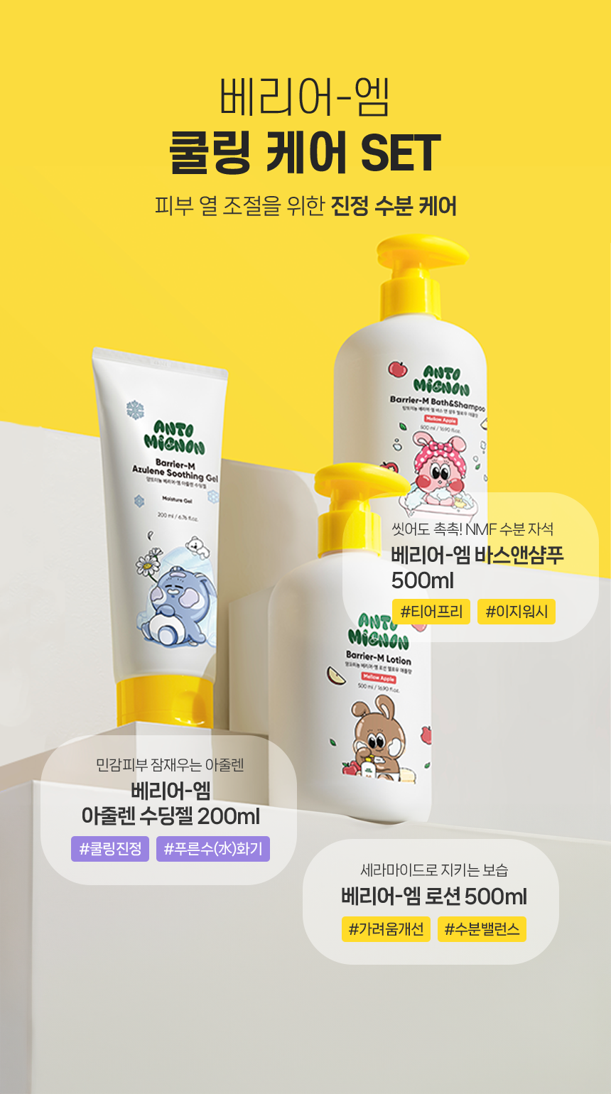 모든 원료성분 | [로션] 정제수, 카프릴릭/카프릭트라이글리세라이드, 글리세린, 부틸렌글라이콜, 세테아릴알코올, 세틸에틸헥사노에이트, 솔비탄스테아레이트, 1,2-헥 산다이올, 시어버터, 세테아릴올리베이트, 트레할로오스, 솔비탄올리베이트, 암모늄아크릴로일다이메틸타우레이트/브이피코폴리머, 카보머, 알 지닌, 락토바실러스발효용해물, 에틸헥실글리세린, 소듐파이테이트, 하이드로제네이티드레시틴, 세라마이드엔피, 베타인, 해바라기씨오일, 산 돌배잎추출물, 콜레스테롤, 마카다미아씨오일, 스쿠알란, 유채스테롤, 올레익애씨드, 스테아릭애씨드, 토코페롤, 호호바씨오일, 캐모마일꽃추출 물, 하이알루로닉애씨드, 글라이신, 세린, 글루타믹애씨드, 아스파틱애씨드, 류신, 알라닌, 라이신, 타이로신, 페닐알라닌, 프롤린, 트레오닌, 발 린, 아이소류신, 히스티딘, 시스테인, 메티오닌, 향료(멜로우애플향) [바스앤샴푸] 정제수, 다이소듐코코일글루타메이트, 글리세린, 아크릴레이트코폴리머, 라우릴베타인, 코카마이드미파, 소듐클로라이드, 트레할로오스, 하이 드록시아세토페논, 소듐스위트아몬드암포아세테이트, 베타인, 다이소듐이디티에이, 에틸헥실글리세린, 소듐코코일애플아미노산, 헥실렌글라이 콜, 캐모마일꽃추출물, 트루로즈오브예리코추출물, 빙하수, 테트라소듐글루타메이트다이아세테이트, 부틸렌글라이콜, 분홍바늘꽃꽃/잎/줄기추 출물, 1,2-헥산다이올, 글라이신, 세린, 글루타믹애씨드, 시어버터, 카프릴릭/카프릭트라이글리세라이드, 해바라기씨오일, 올리브오일, 호호바씨 오일, 하이드로제네이티드레시틴, 스쿠알란, 아스파틱애씨드, 류신, 펜틸렌글라이콜, 알라닌, 라이신, 알지닌, 타이로신, 페닐알라닌, 트레오닌, 발린, 프롤린, 아이소류신, 카프릴릴글라이콜, 히스티딘, 메티오닌, 시스테인, 락토바실러스발효용해물, 세라마이드엔피, 콜레스테롤, 피토스핑 고신, 마그네슘피씨에이, 카퍼트라이펩타이드-1, 수크로오스, 칼슘클로라이드, 씨솔트, 마그네슘클로라이드, 하이알루로닉애씨드, 다이포타슘 포스페이트, 마그네슘시트레이트, 글루코사민에이치씨엘, 1-메틸하이단토인-2-이미드, 아스파라진, 시트룰린, 타우린, 트립토판, 포믹애씨드, 글루타민, 향료(멜로우애플향) [수딩젤] 정제수, 프로판다이올, 1,2-헥산다이올, 다이프로필렌글라이콜, 글리세레스-26, 마트리카리아꽃추출물, 라피노오스, 글리세린, 판테놀, 폴리글리 세린-3, 카보머, 트로메타민, 부틸렌글라이콜, 알란토인, 베타인, 트레할로오스, 해수, 빙하수, 에틸헥실글리세린, 티트리잎추출물, 병풀추출물, 다이소듐이디티에이, 글리세릴아크릴레이트/아크릴릭애씨드코폴리머, 소듐하이알루로네이트, 락토바실러스발효용해물, 소듐구아이아줄렌설 포네이트, 글라이신, 세린, 글루타믹애씨드, 아스파틱애씨드, 류신, 알라닌, 라이신, 알지닌, 타이로신, 페닐알라닌, 프롤린, 트레오닌, 발린, 아이 소류신, 히스티딘, 시스테인, 메티오닌, 해바라기씨오일, 스쿠알란, 아시아틱애씨드, 아시아티코사이드, 마데카식애씨드, 마데카소사이드 |