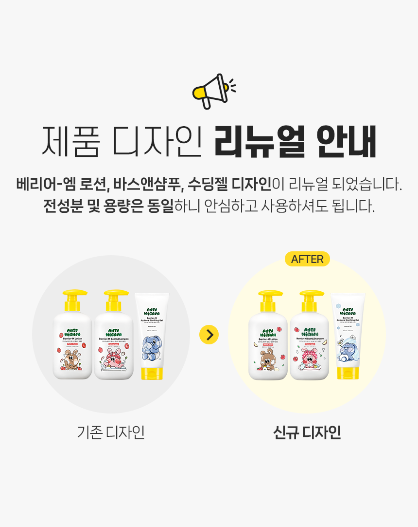 사용방법 | [로션] 세안·목욕 후 건조함이 느껴질 때마다 수시로 적당량을 덜어 피부에 부드럽게 펴 발라주세요. * 건조한 부위는 여러 번 덧발라 주시면 좋습니다. [바스앤샴푸] 적당량을 목욕용 스펀지나 타월에 묻혀 거품을 낸 다음 전신에 마사지하듯이 문지른 후 물로 깨끗이 씻어냅니다. [수딩젤] 세안·목욕 후 얼굴과 전신에 부드럽게 펴 발라 흡수시켜 줍니다. * 햇빛에 노출되어 민감하고 붉어지기 쉬운 피부에 수시로 덧발라 주시면 좋습니다. |