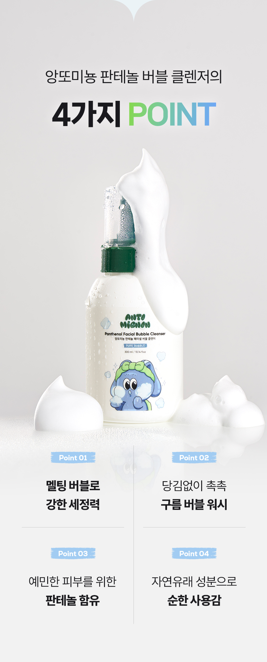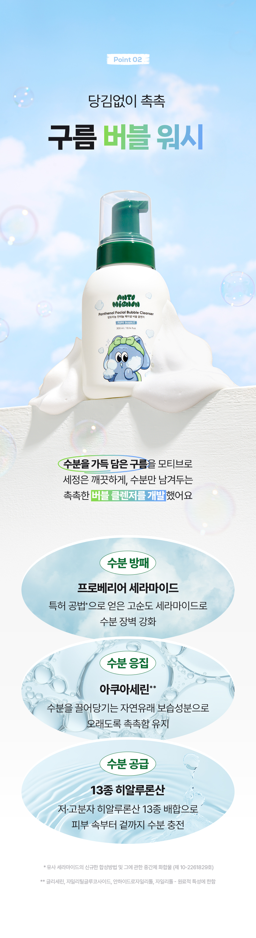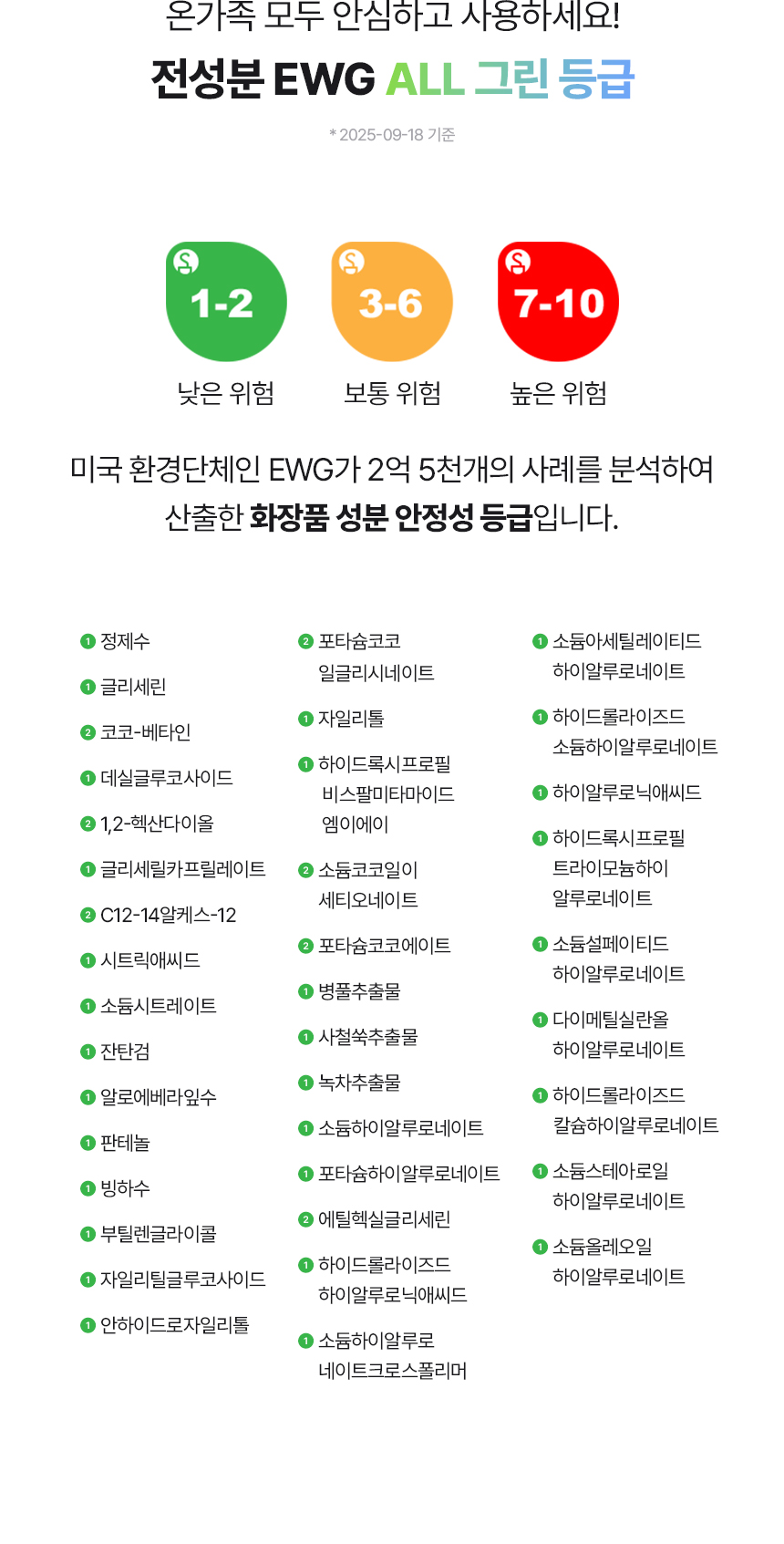 | 모든 원료성분 | 정제수, 글리세린, 코코-베타인, 데실글루코사이드, 1,2-헥산다이올, 글리세릴카프릴레이트, C12-14알케스-12, 시트릭애씨드, 소듐시트레이트, 잔탄검, 알로에베라잎수, 판테놀(10PPM), 빙하수, 부틸렌글라이콜, 자일리틸글루코사이드, 안하이드로자일리톨, 포타슘코코일글리시네이트, 자일리톨, 하이드록시프로필비스팔미타마이드엠이에이, 소듐코코일이세티오네이트, 포타슘코코에이트, 병풀추출물, 사철쑥추출물, 녹차추출물, 소듐하이알루로네이트, 포타슘하이알루로네이트,에틸헥실글리세린, 하이드롤라이즈드하이알루로닉애씨드, 소듐하이알루로네이트크로스폴리머, 소듐아세틸레이티드하이알루로네이트, 하이드롤라이즈드소듐하이알루로네이트, 하이알루로닉애씨드, 하이드록시프로필트라이모늄하이알루로네이트, 소듐설페이티드하이알루로네이트, 다이메틸실란올하이알루로네이트,하이드롤라이즈드칼슘하이알루로네이트, 소듐스테아로일하이알루로네이트, 소듐올레오일하이알루로네이트 |